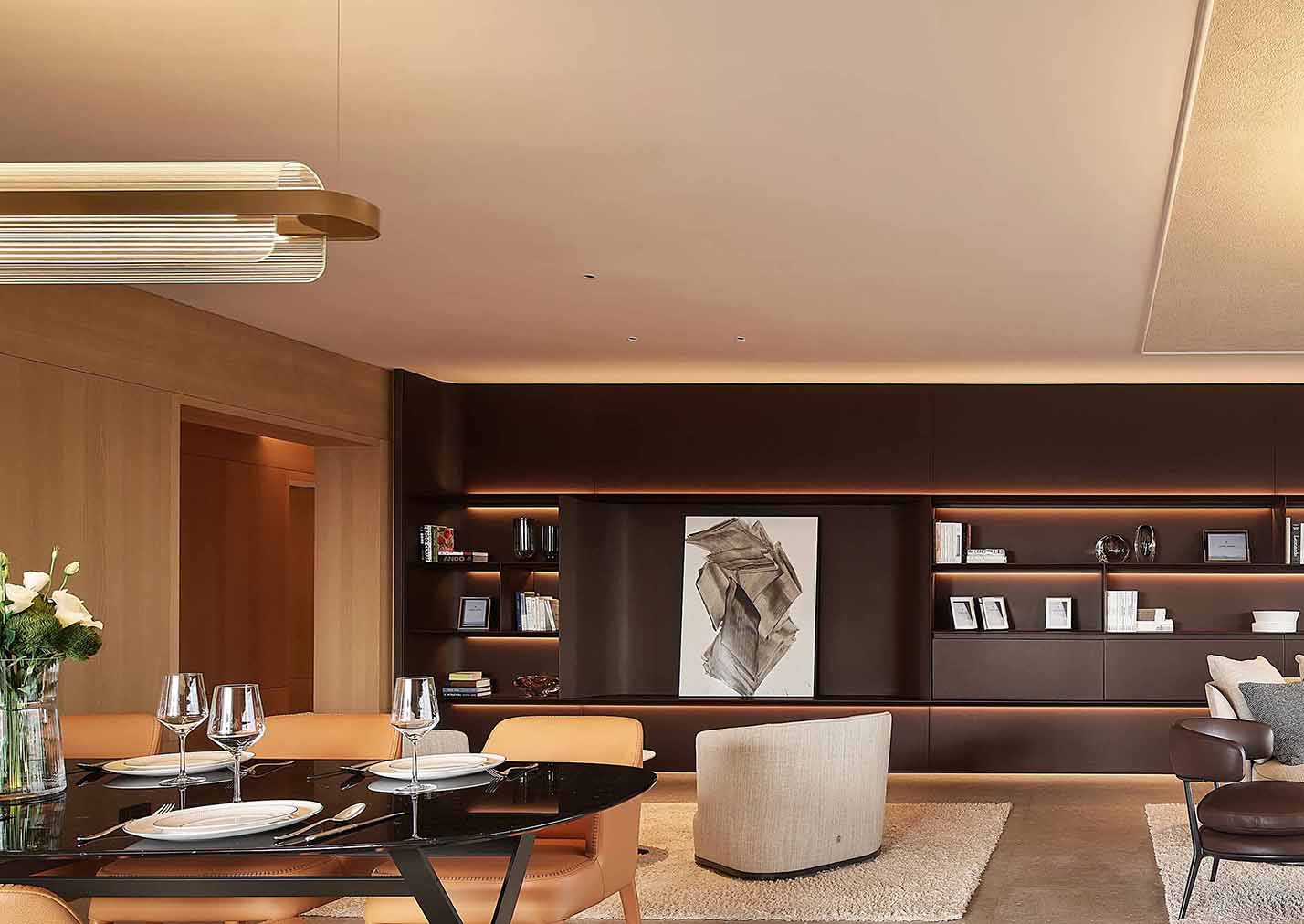 In una sala da pranzo a Beijing Dongzhimen N.8, Pechino, la Nami diffonde una luce lineare e morbida, accompagnando la composizione con equilibrio. Il diffusore ondulato dialoga con superfici calde e materiali raffinati, contribuendo a un interno contemporaneo dal carattere forte e delicato.