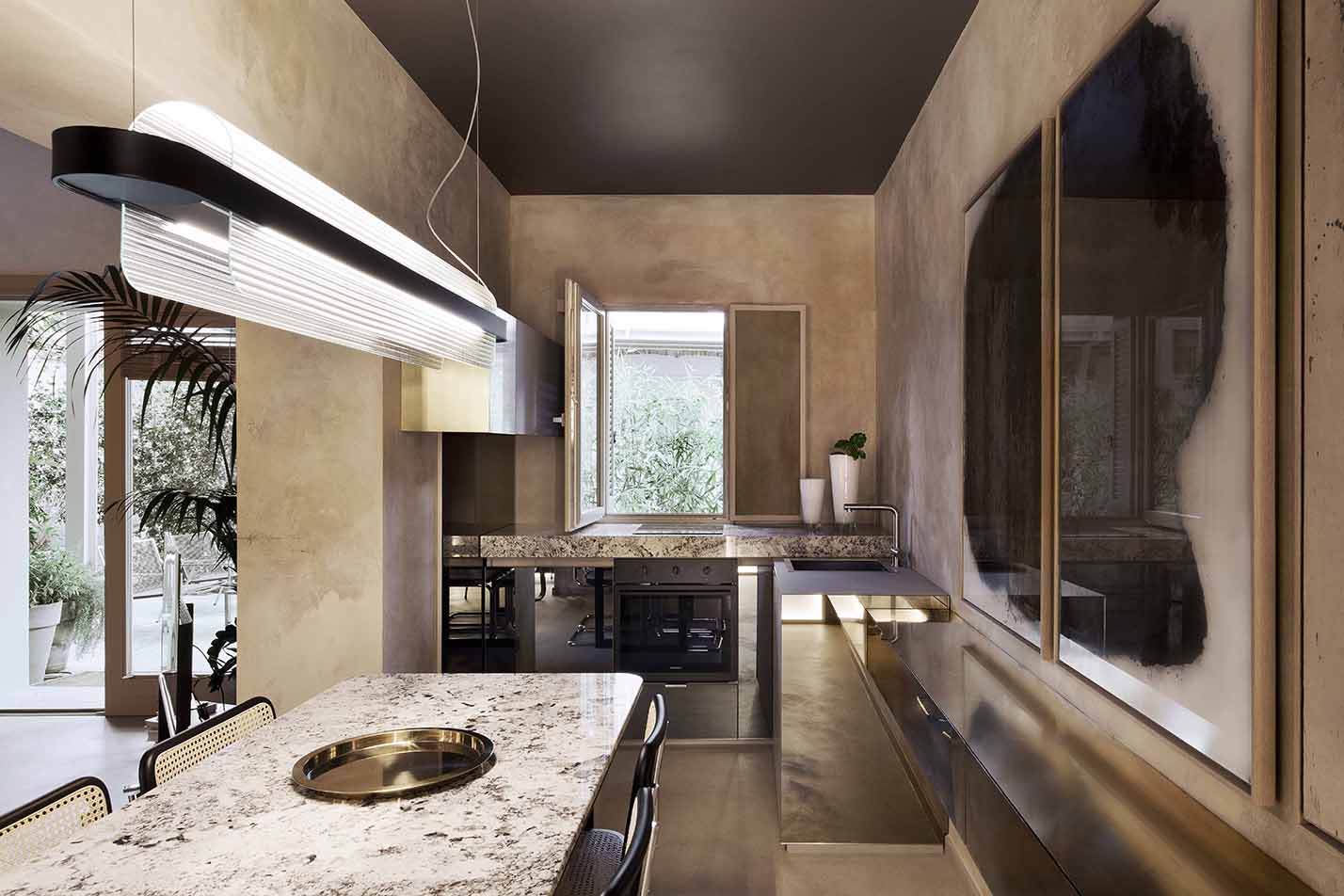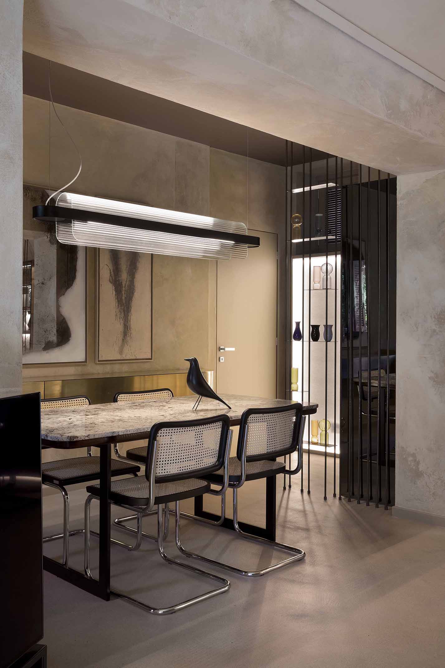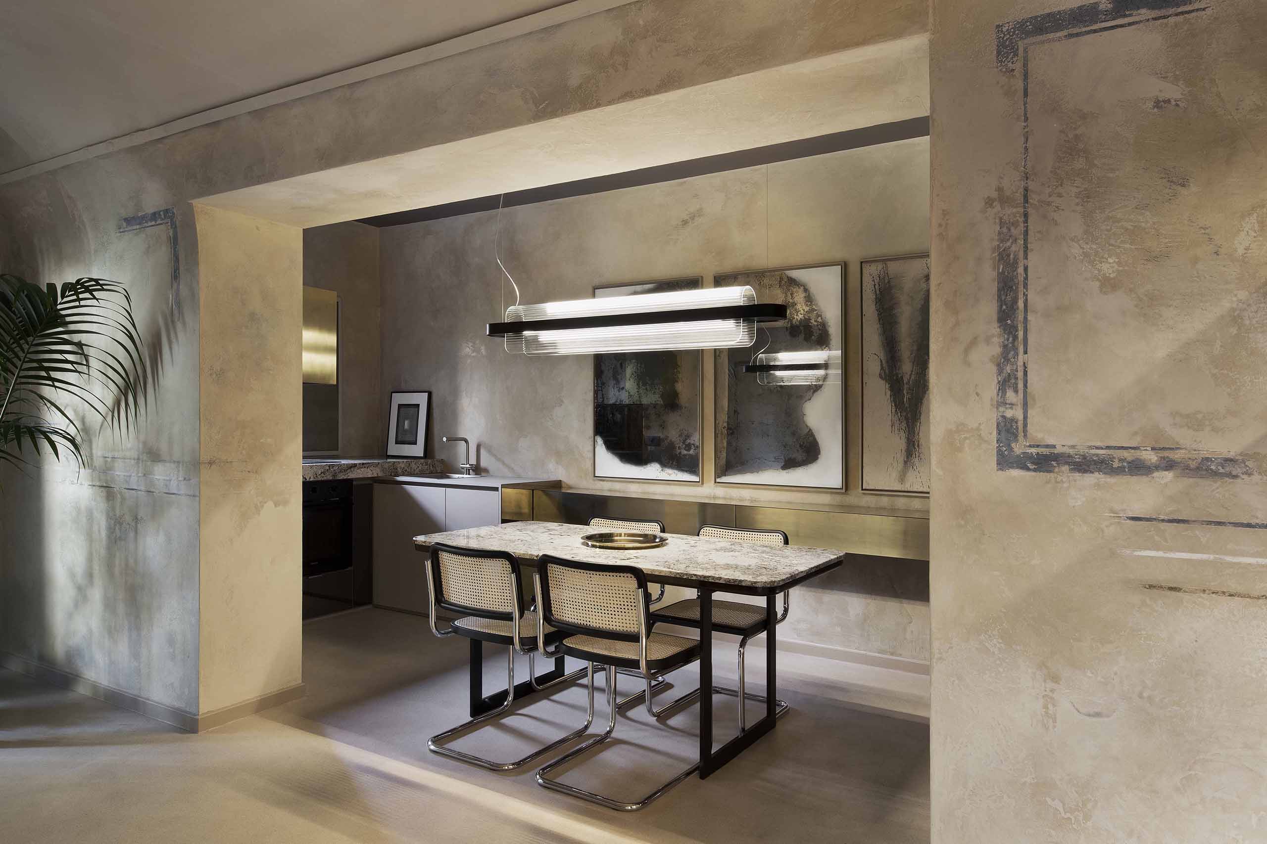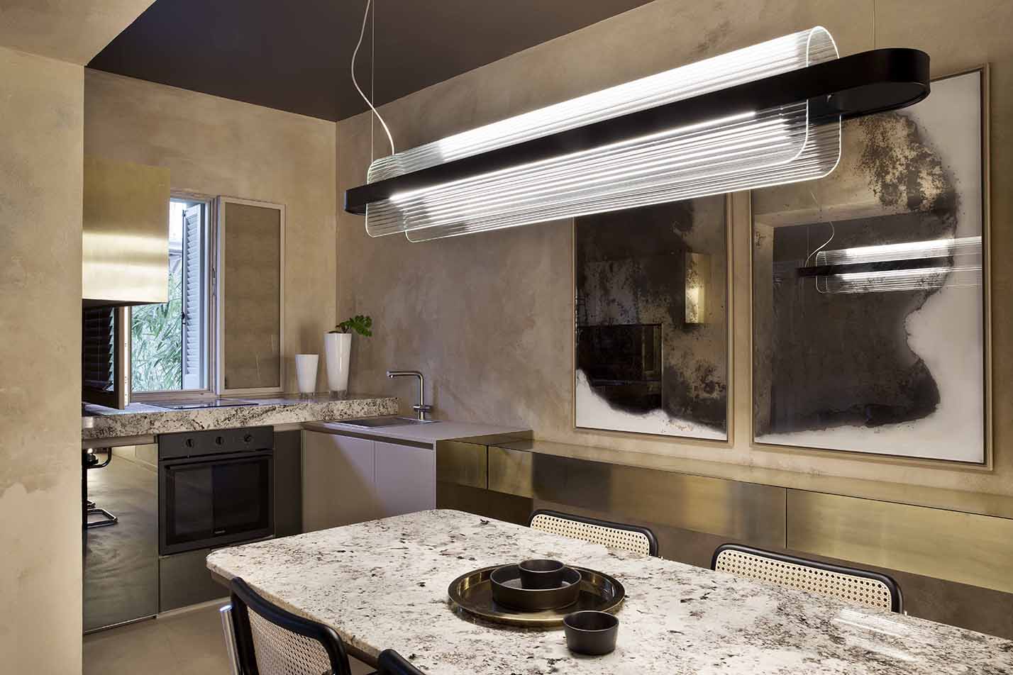 In un ambiente sofisticato e accogliente a Bra, la Nami definisce lo spazio con una luce lineare e diffusa. Il diffusore ondulato crea un segno grafico sospeso, dialogando con superfici materiche e tonalità calde in un interno contemporaneo e misurato.