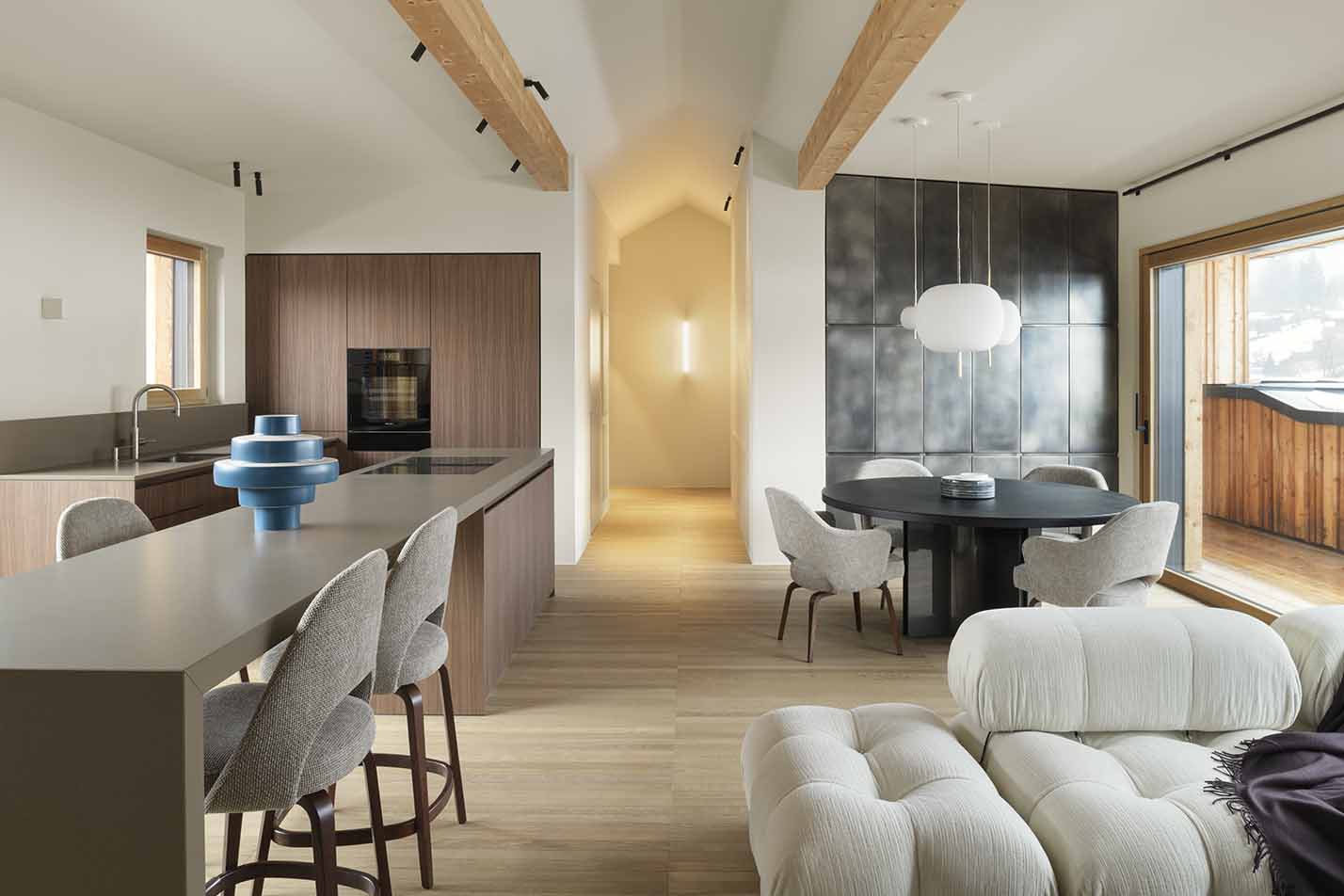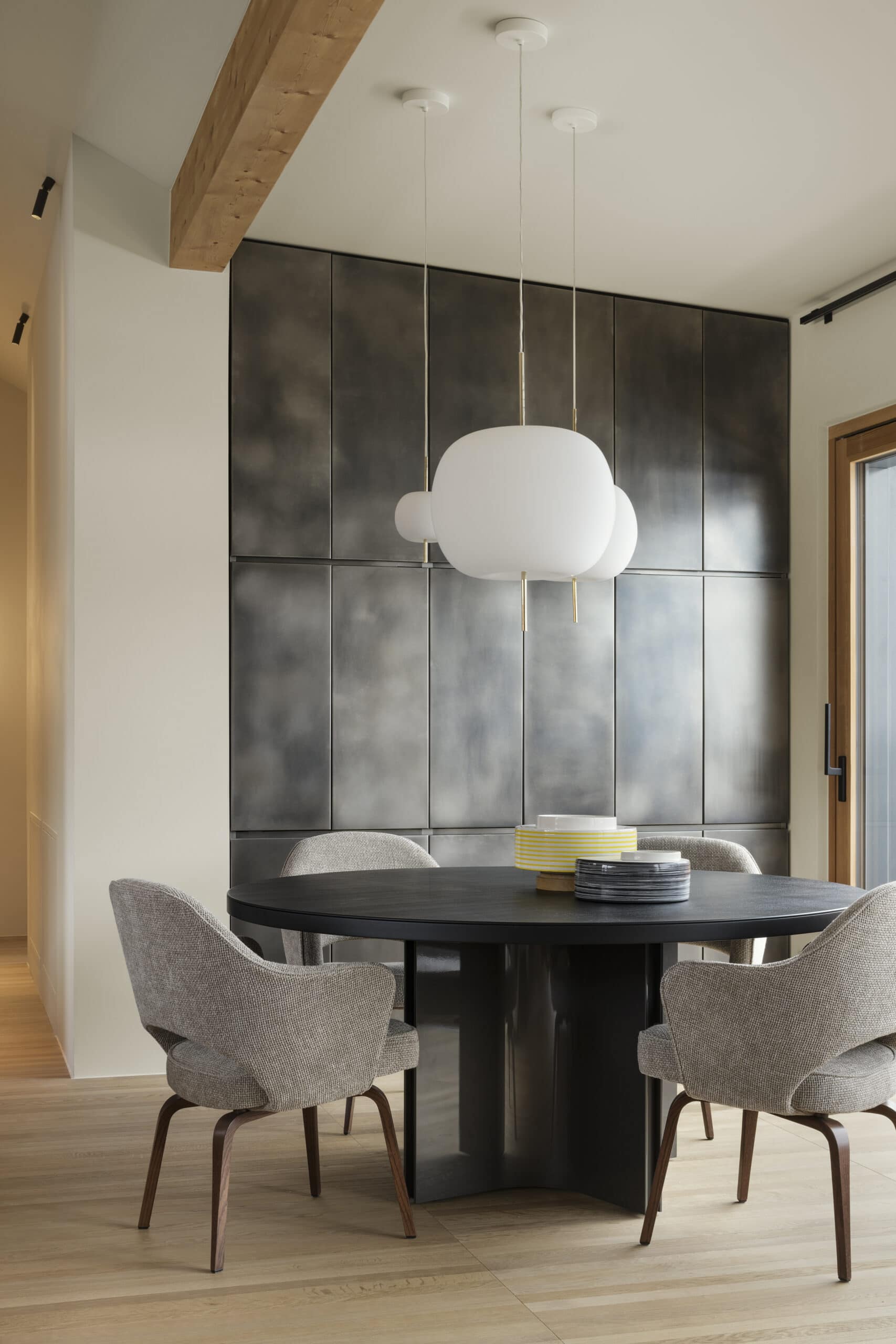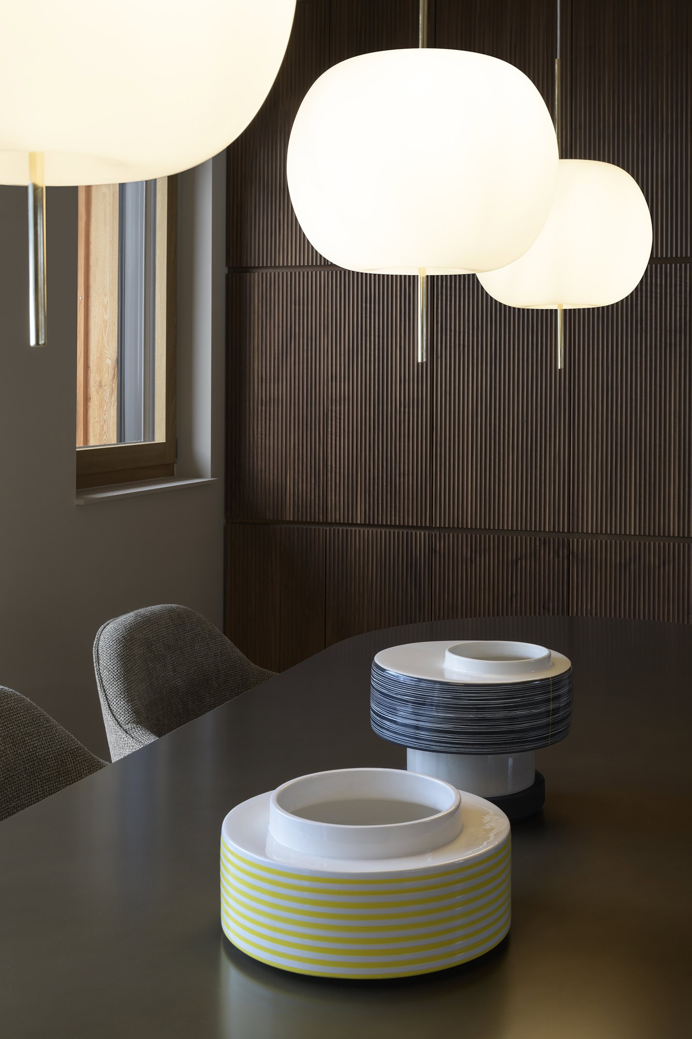 Nel cuore degli appartamenti residenziali di Kirchberg, Lussemburgo, la Kushi Suspension nei tre diametri 16,33 e 43 cm definisce lo spazio con una luce morbida e diffusa. Le forme essenziali e la composizione equilibrata dialogano con legno e toni neutri, contribuendo a un interno dall’atmosfera calda ed esclusiva.