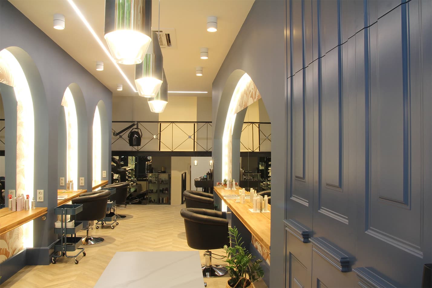 Presso il Nem Beauty Saloon di Bilbao, le Yuma aggiungono un tocco di glamour. La finitura metallica lucida riflette la luce con eleganza sopra le postazioni di lavoro, creando un ritmo visivo che esalta il design ricercato del salone e offre un’illuminazione puntuale e raffinata.