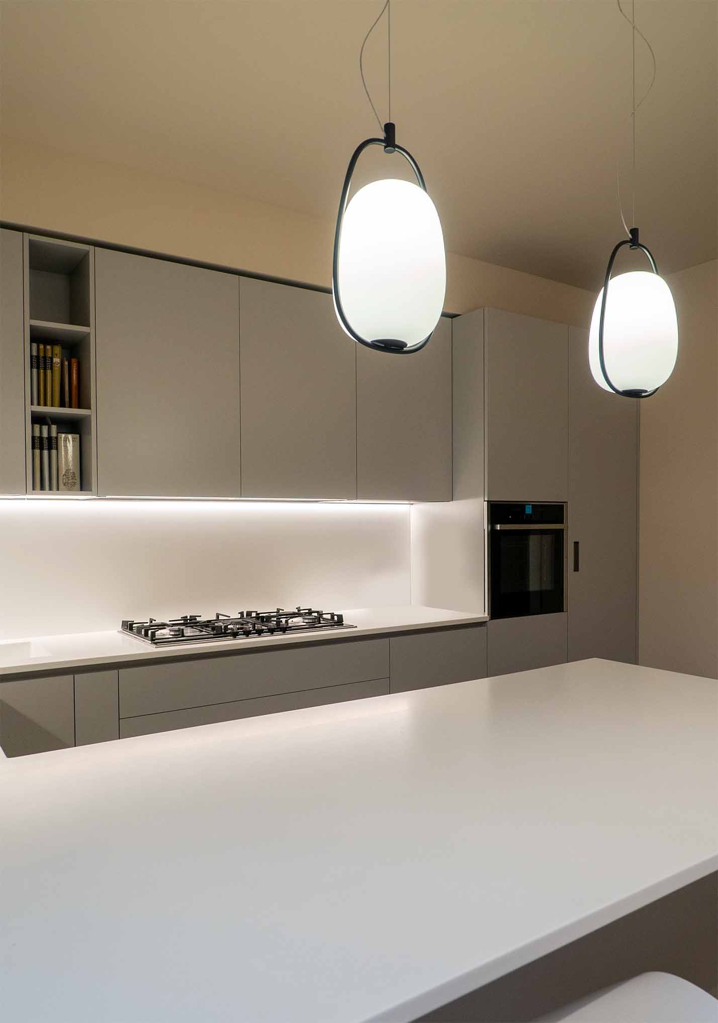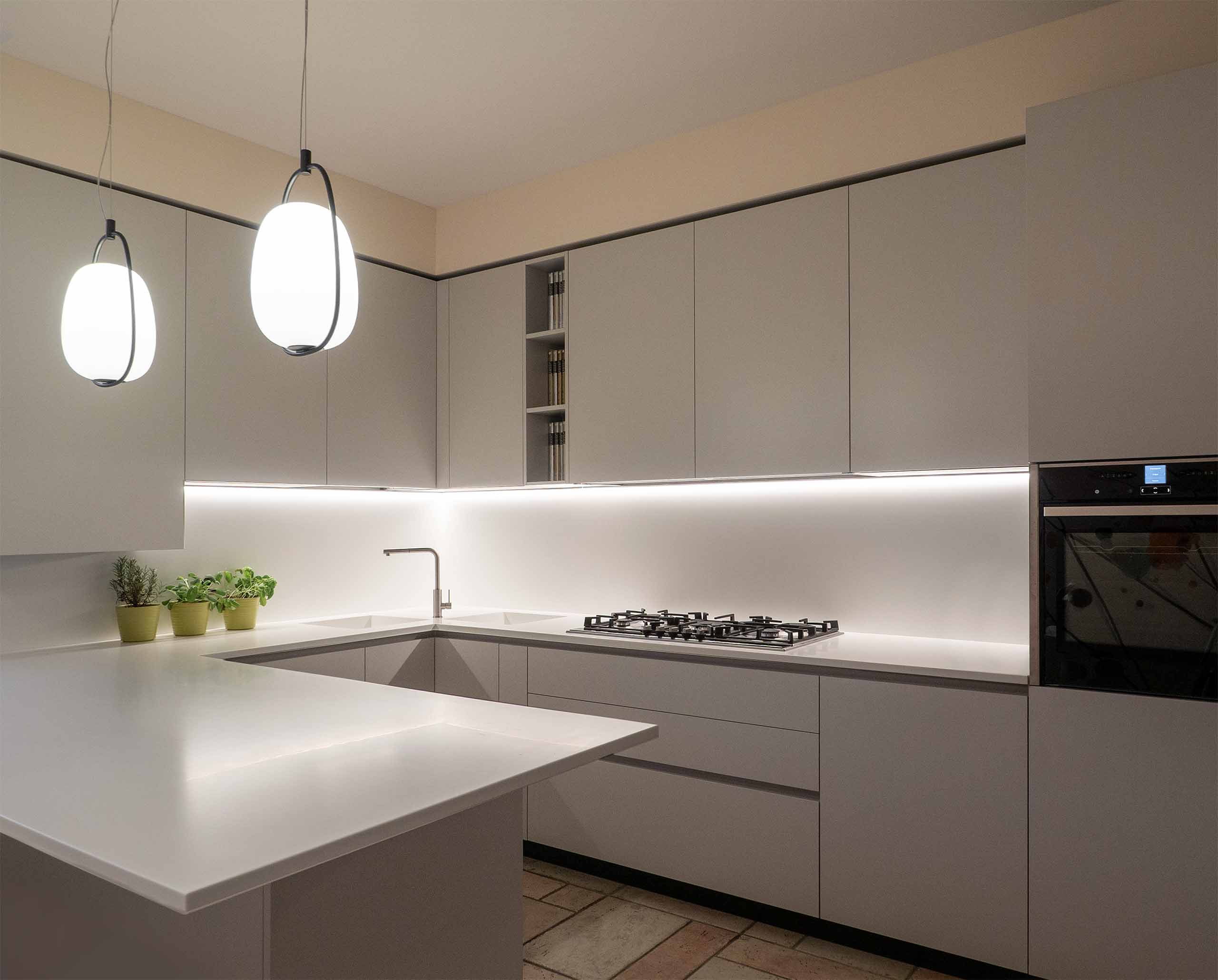 In questa cucina italiana, le Lannà Suspension creano un’atmosfera romantica. La presenza della versione tavolo, in perfetta sintonia con le sospensioni, garantisce una continuità stilistica che bilancia la pulizia formale e la funzionalità dell’ambiente attraverso un design coerente e accogliente.