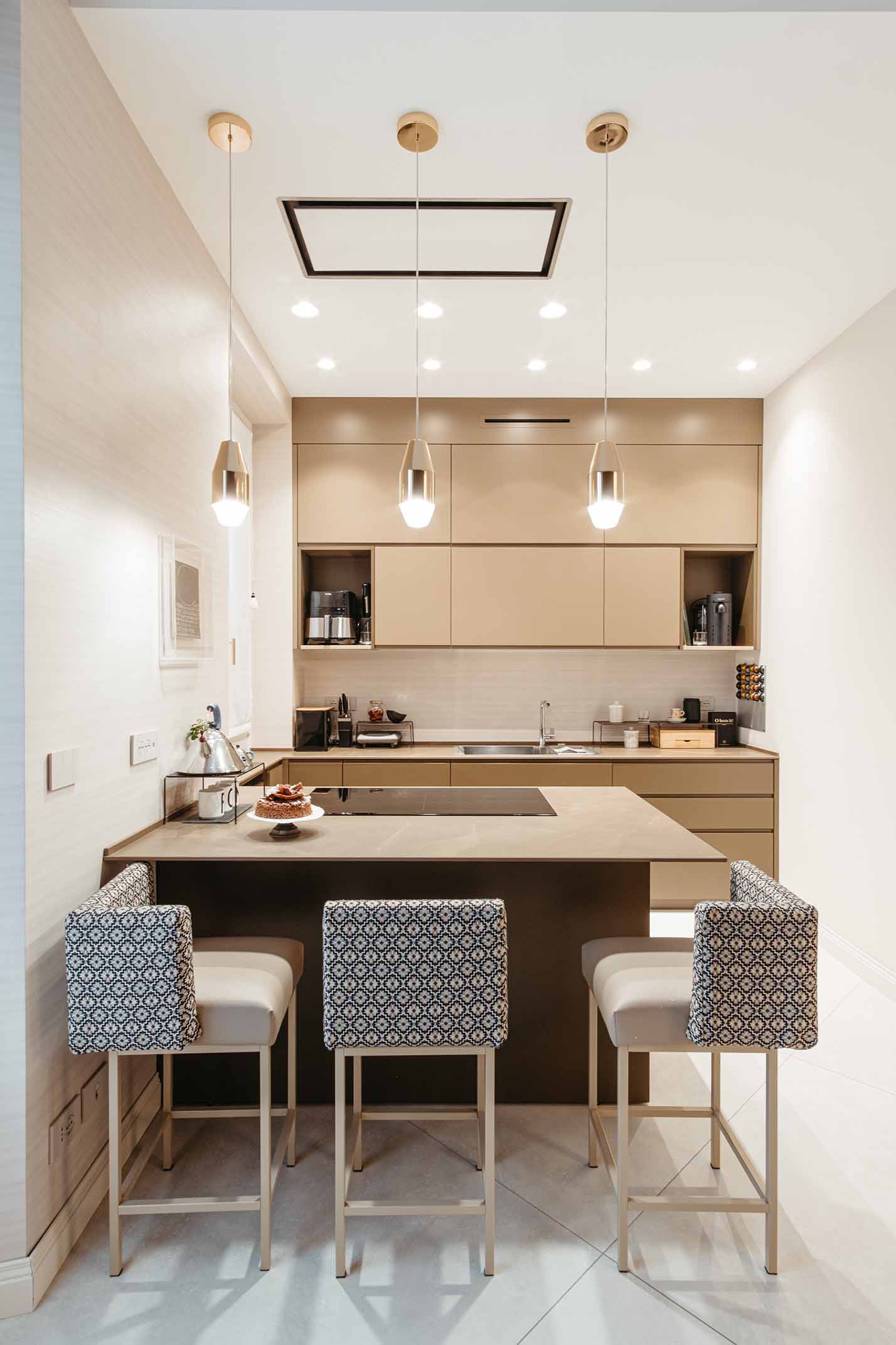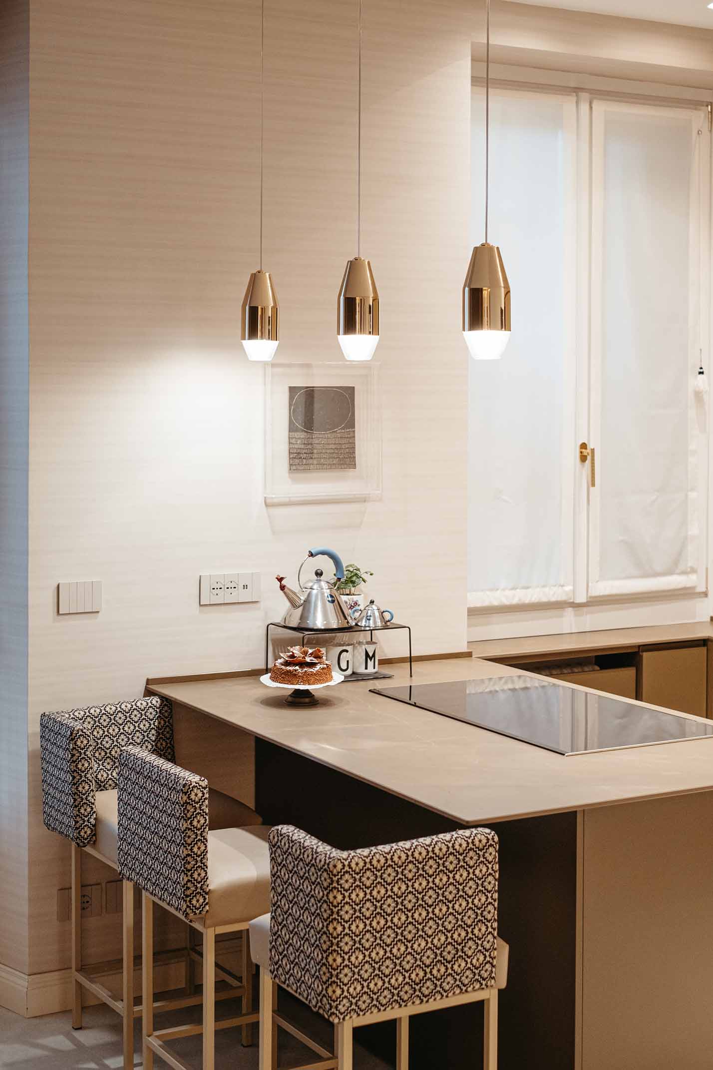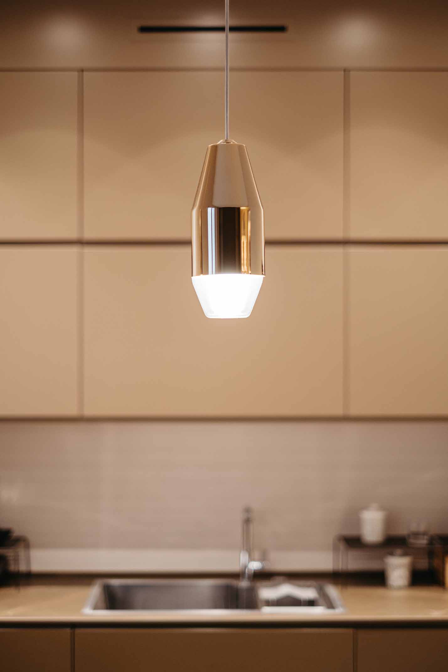 Sopra l’isola di una cucina moderna in Italia, le Yuma riflettono lo spazio con le loro superfici metalliche lucide. La matericità del metallo e la luce diffusa dal diffusore inferiore creano un ritmo visivo raffinato, aggiungendo calore e un tocco prezioso all’ambiente conviviale.
