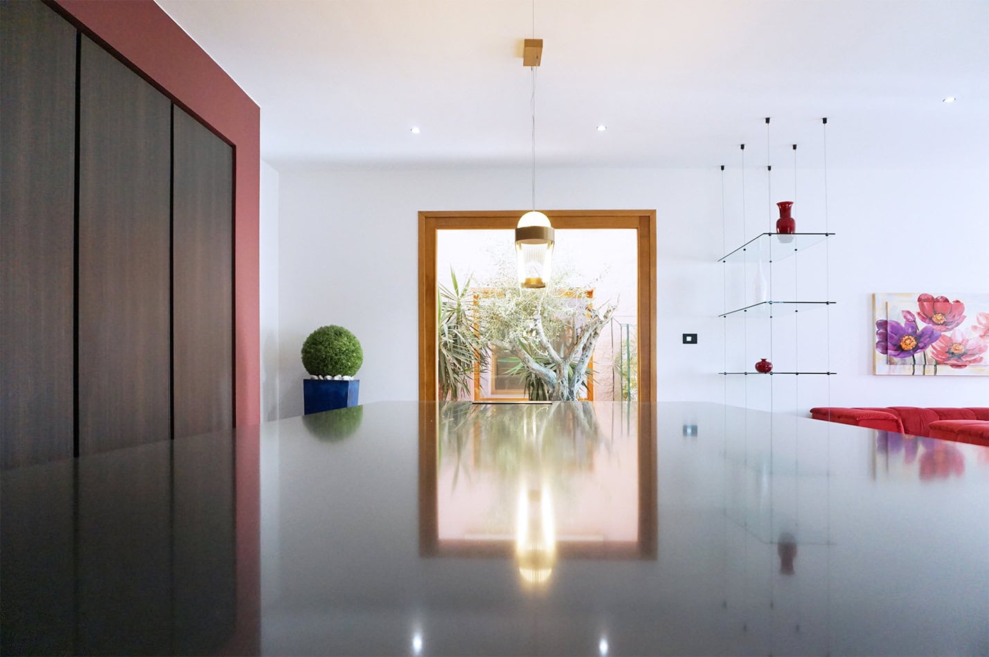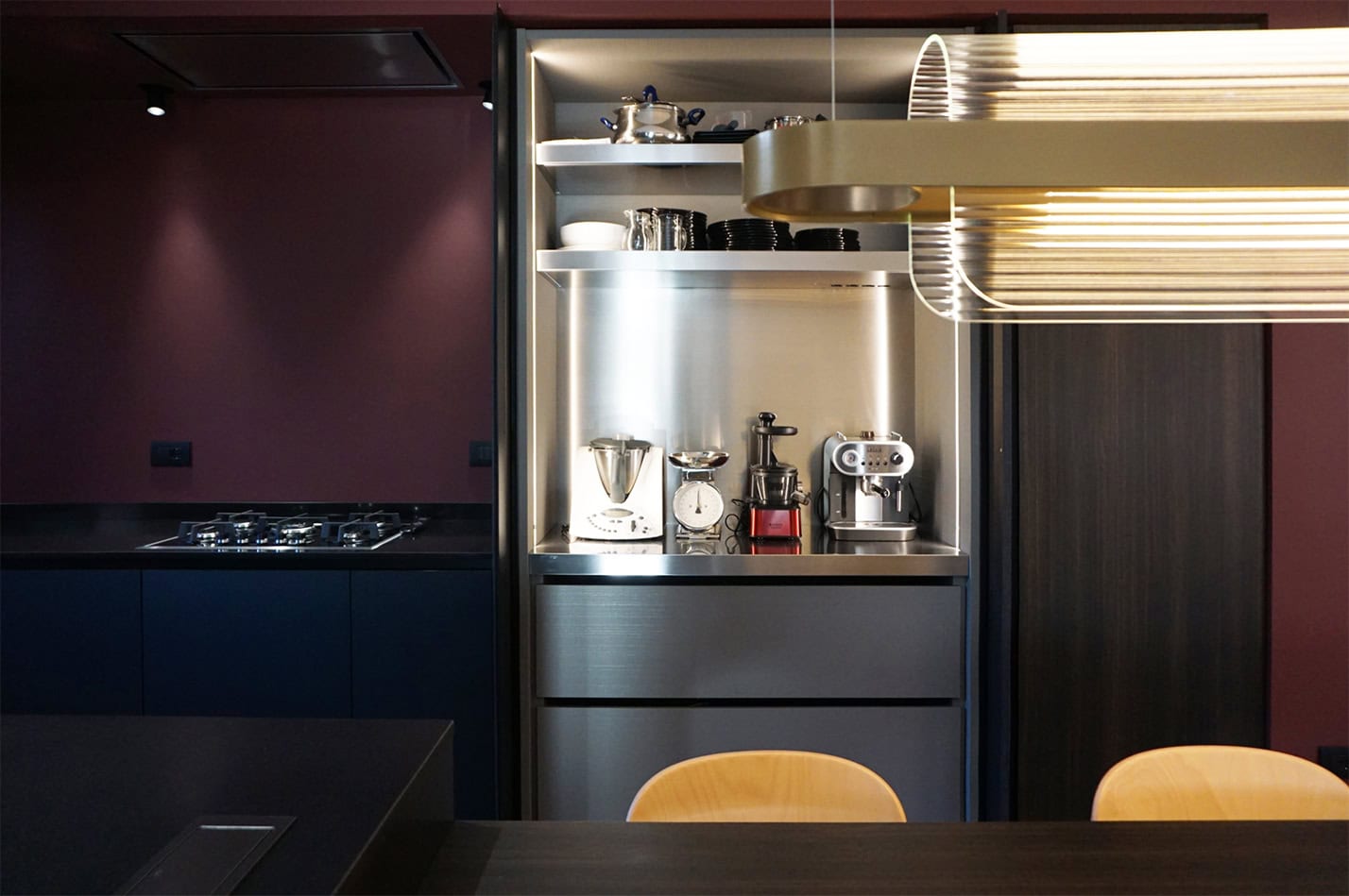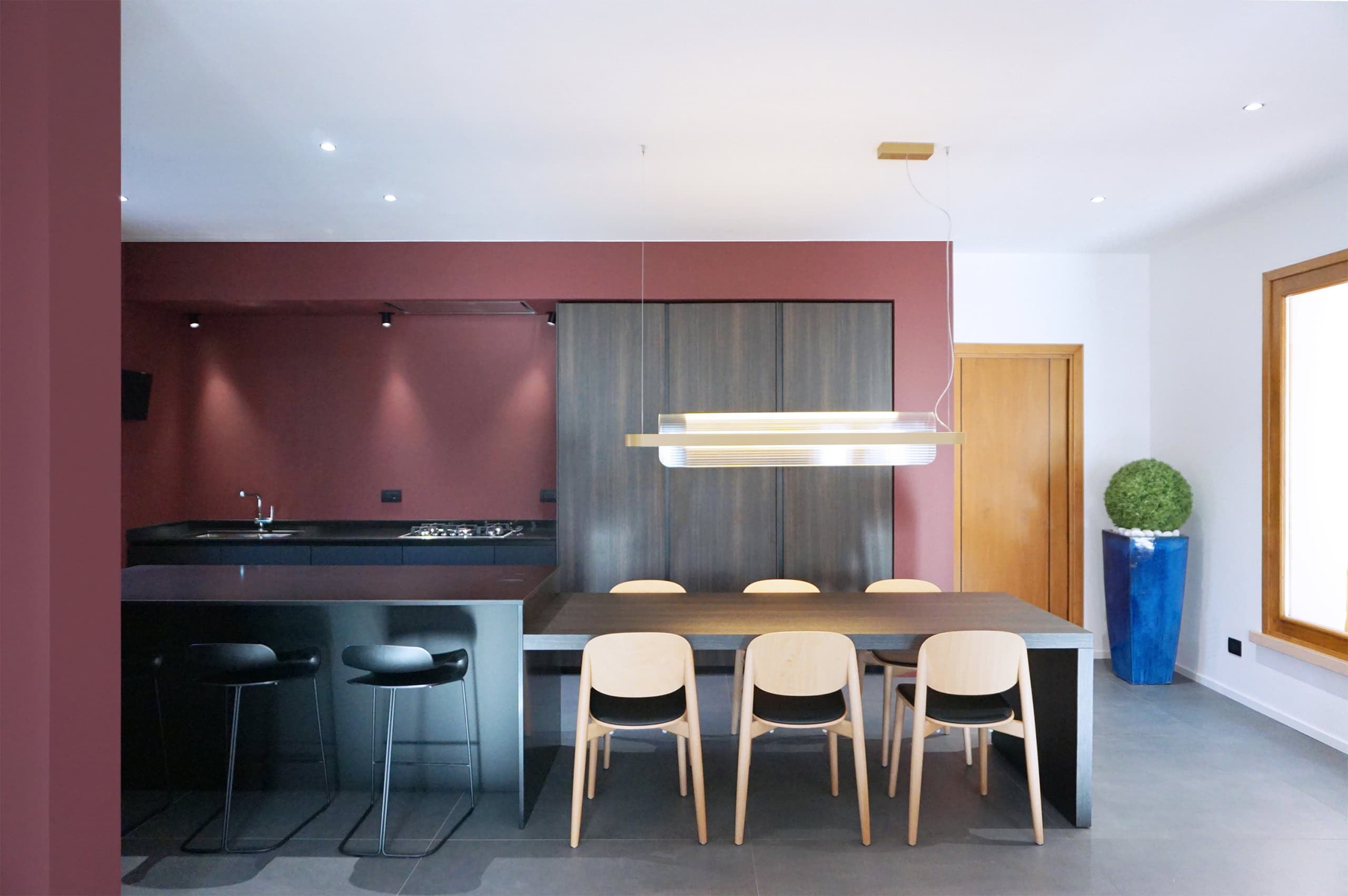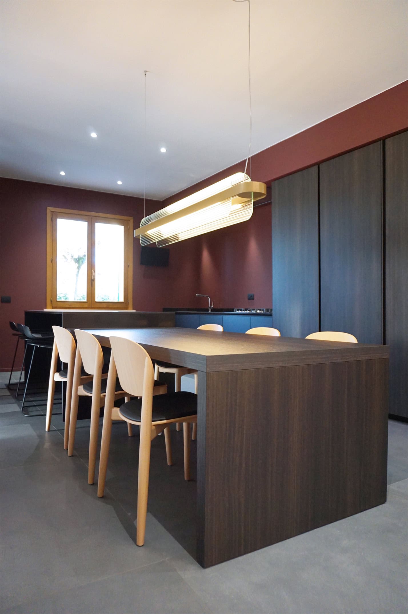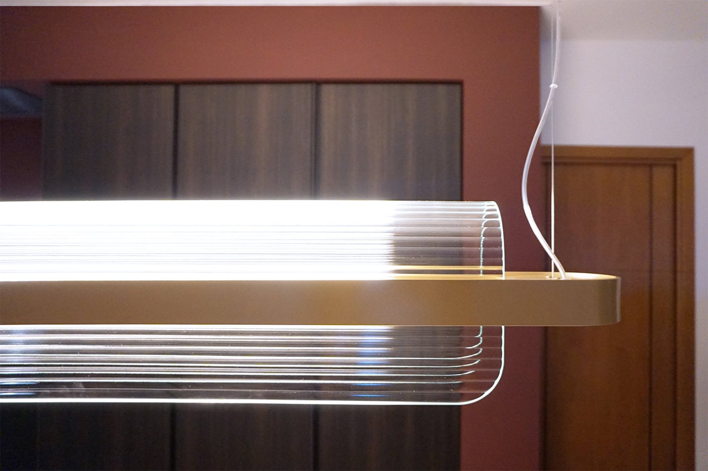 All’interno di una cucina italiana dalle tonalità calde e profonde, la Nami diventa protagonista sopra il tavolo da pranzo. Il diffusore in vetro curvato e rigato canalizza la luce con eleganza, creando un contrasto materico con le superfici scure e valorizzando l’atmosfera intima e conviviale dello spazio.