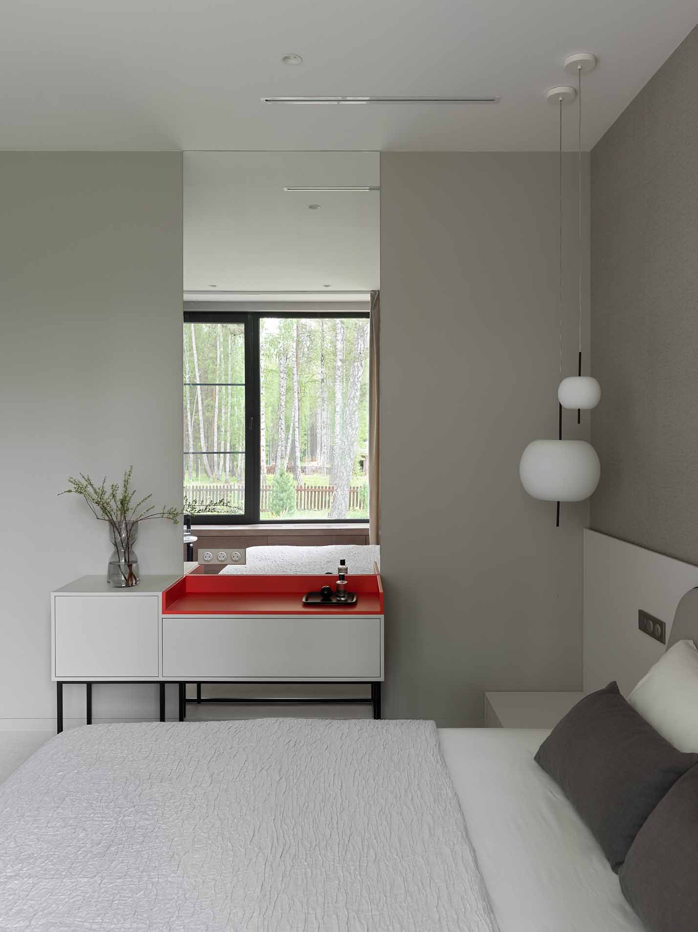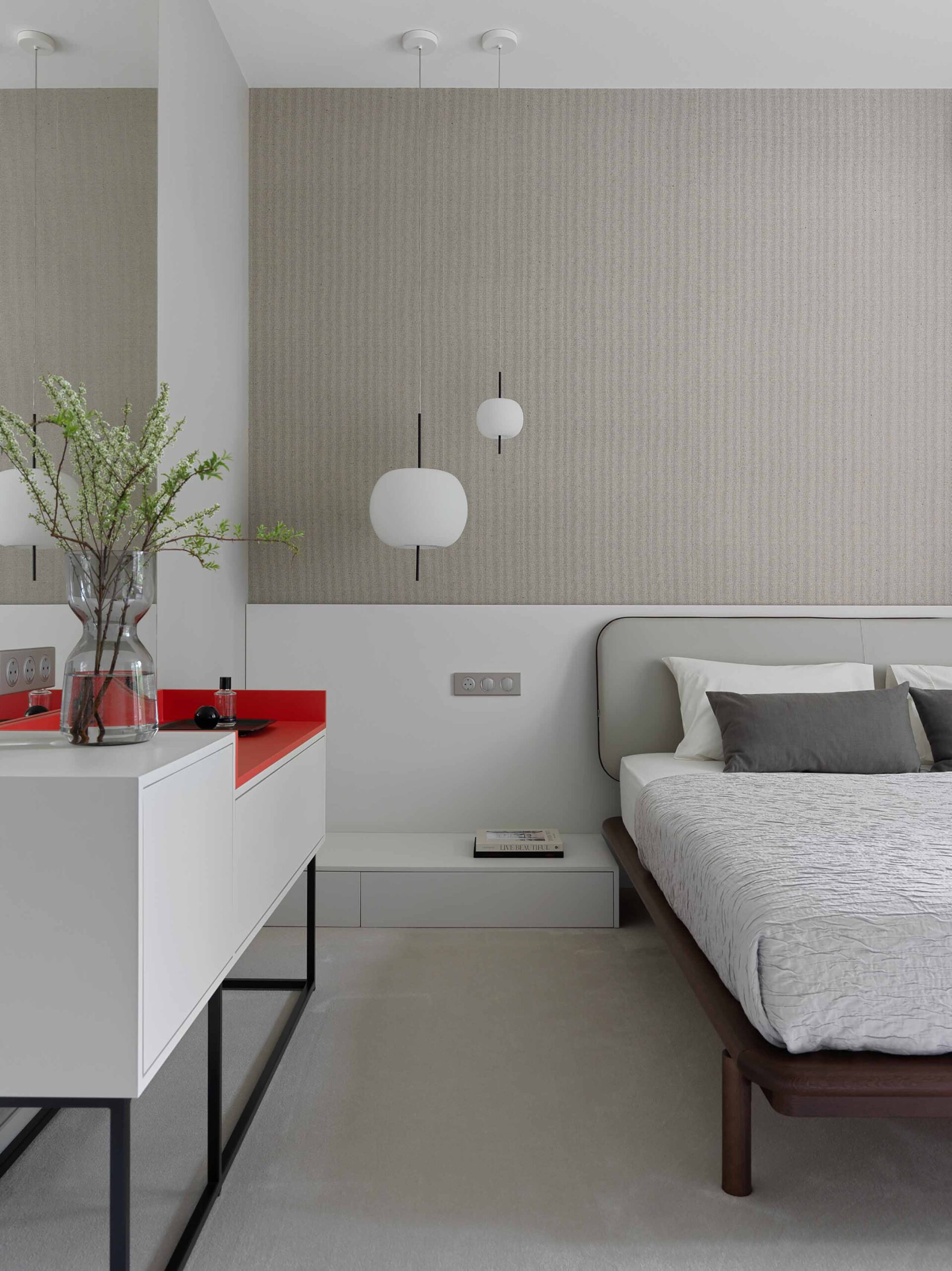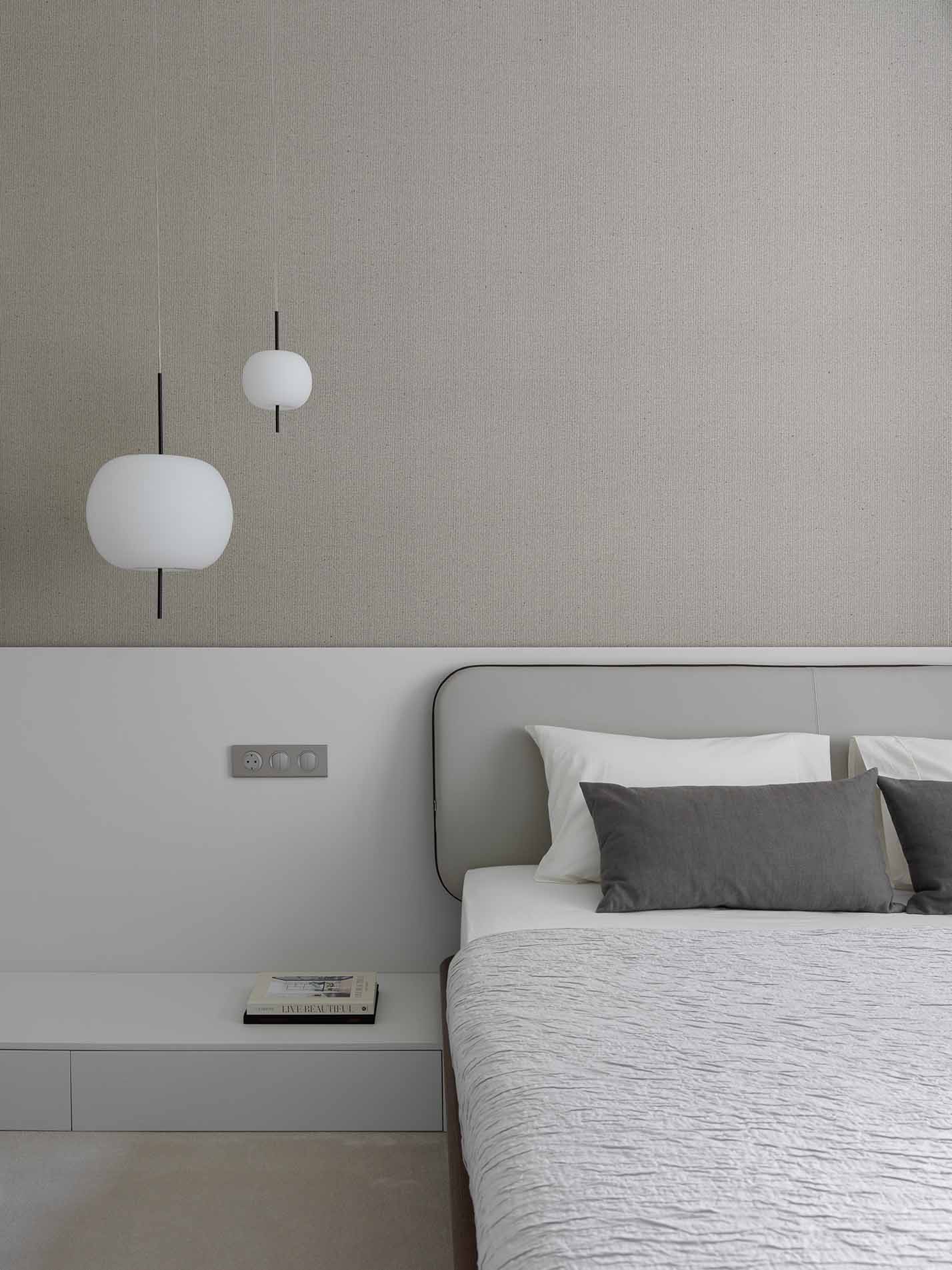 In una camera da letto dal design minimalista, le Kushi sono sospese con leggerezza sopra la zona notte. L’iconica forma del diffusore in vetro opale contrasta armoniosamente con il rigore delle linee geometriche, creando un’atmosfera intima, rilassante e dal carattere sofisticato.