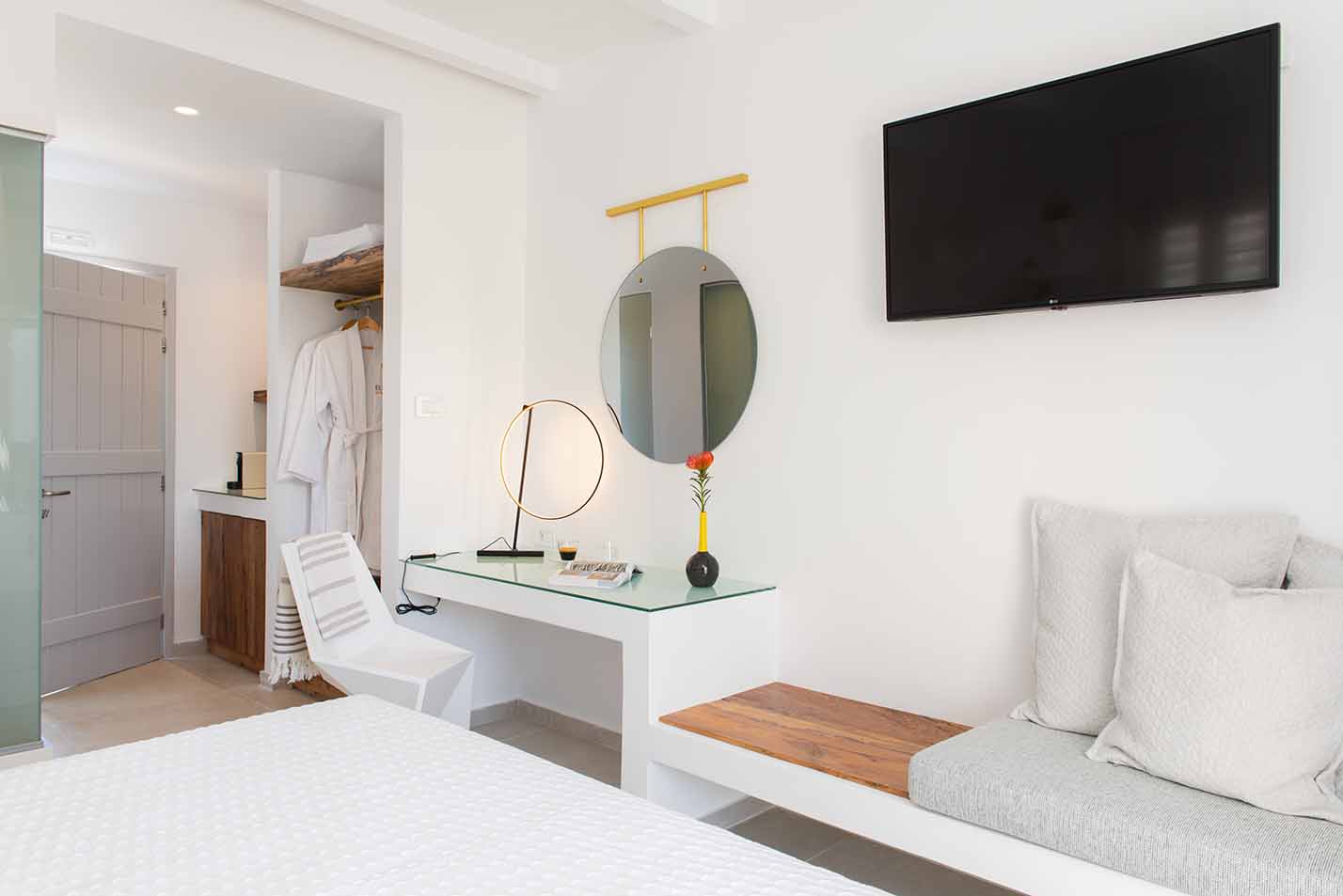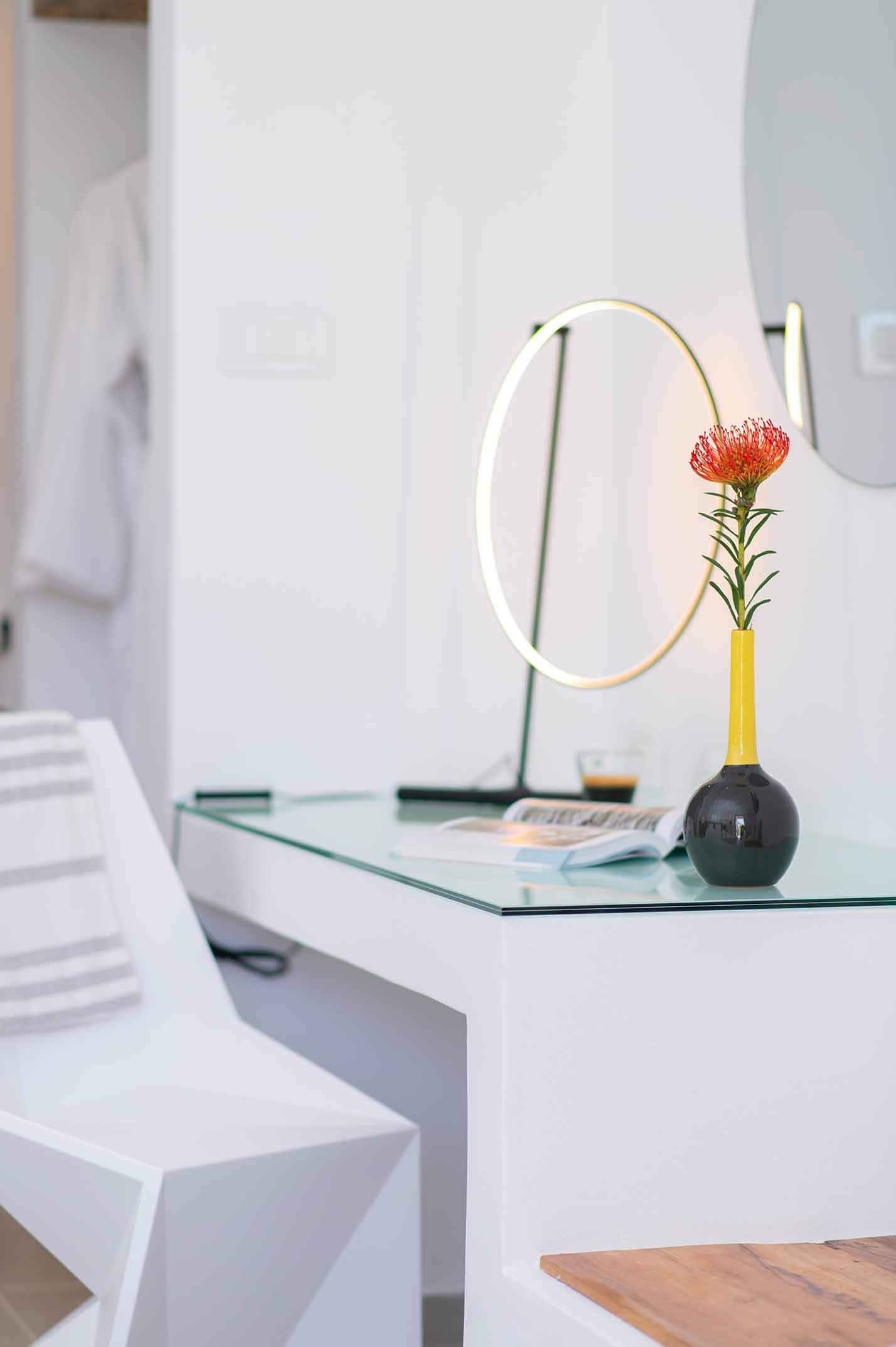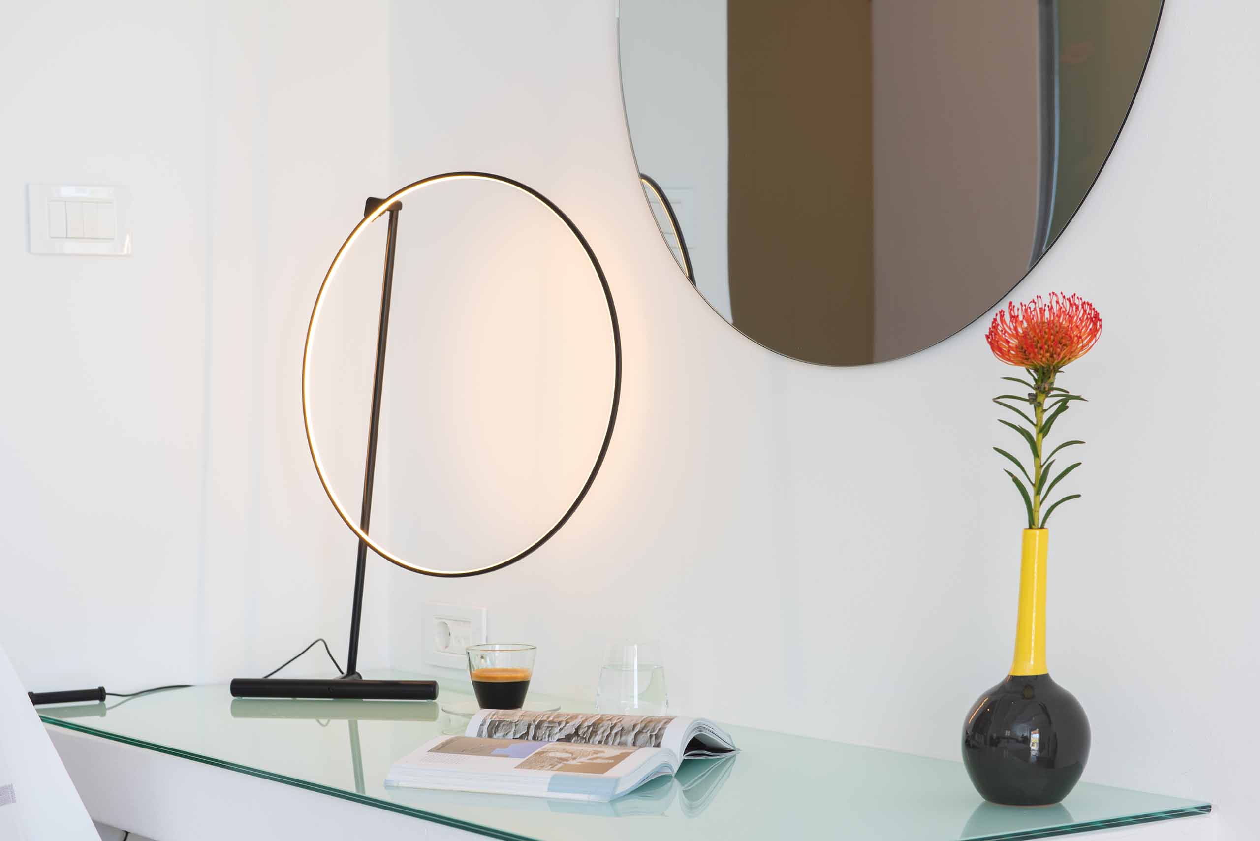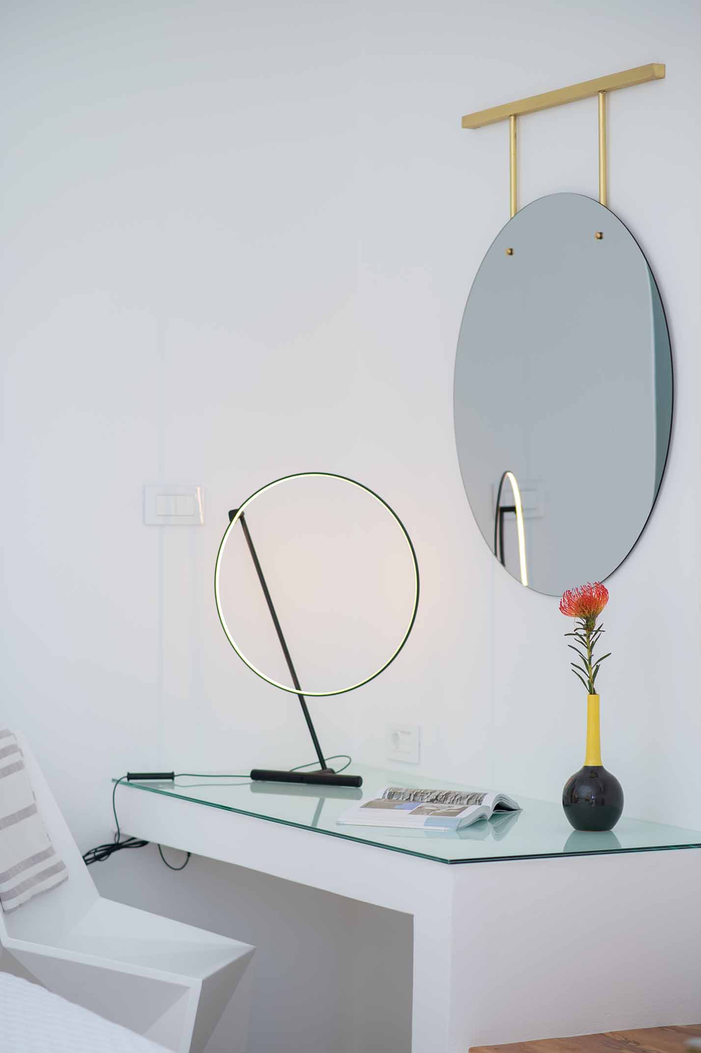 Presso il Sifnos Elements Hotel in Grecia, la lampada da tavolo Poise incanta con la sua silhouette grafica e leggera. Il cerchio di luce, in equilibrio dinamico, dialoga con la purezza del design greco, offrendo un’illuminazione poetica che esalta l’estetica essenziale e luminosa della stanza.